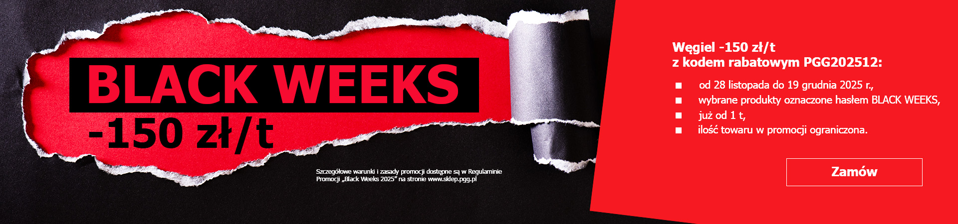 Węgiel -150 zł/t z kodem rabatowym PGG202512W promocji „Black Weeks 2025" kupisz węgiel taniej o 150 zł za tonę z kodem rabatowym PGG202512: § od 28 listopada 2025 r. do 19...