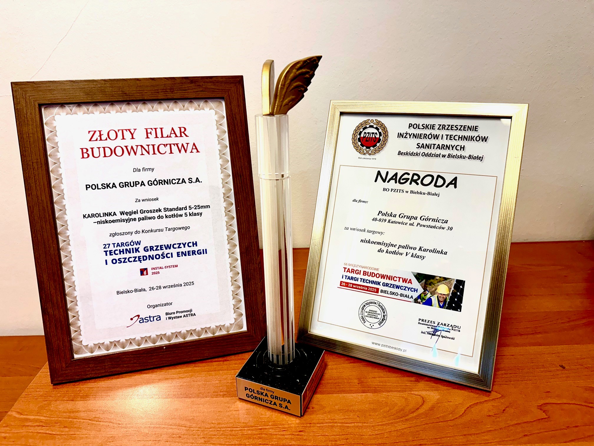 Organizator 66 Międzynarodowych Targów Budownictwa „JESIEŃ 2025” przyznał Polskiej Grupie Górniczej S.A. ZŁOTY FILAR BUDOWNICTWA, a Polskie Stowarzyszenie Inżynierów i Techników Sanitarnych uhonorowało nasz węgiel nagrodą za innowacyjny produkt „Niskoemisyjne paliwo Karolinka do kotłów V klasy”.